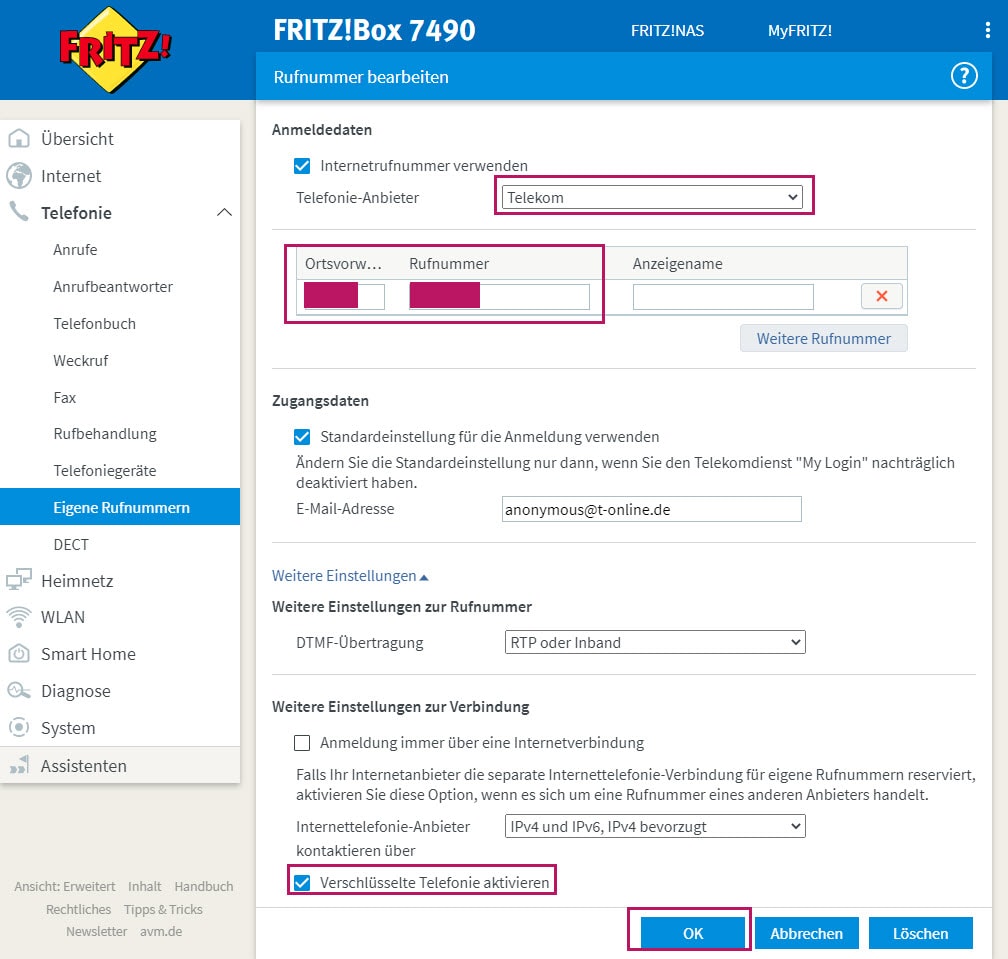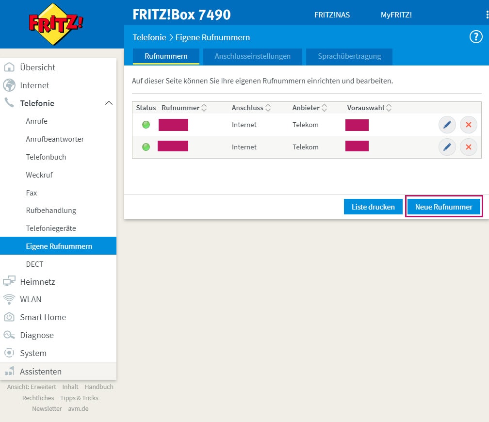 Logge dich in deine FritzBox ein. Dort kannst du beim Punkt Telefonie unter „Eigene Rufnummern“ die neue Telefonnummer einrichten. Die Seite ist im großen und ganzen selbsterklärend.