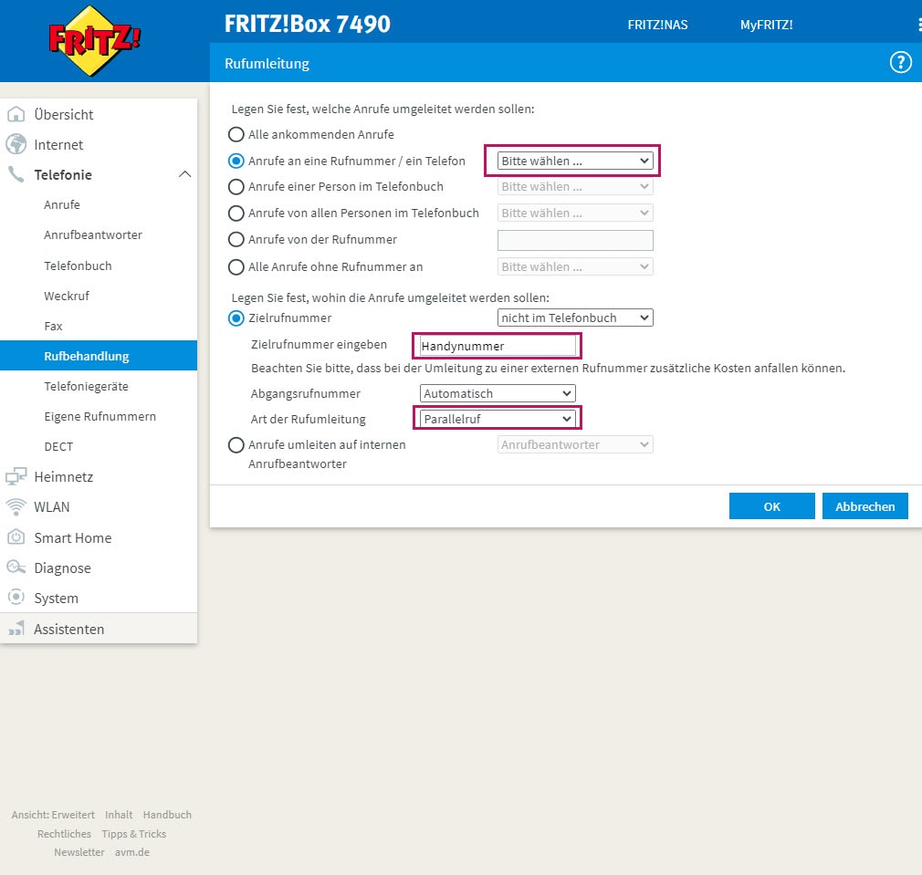 Neue Rufumleitung: Wähle oben die neue Rufnummer aus, gib unten deine Handynummer ein. Am Ende bei „Art der Rufumleitung“ Parallelruf einstellen.