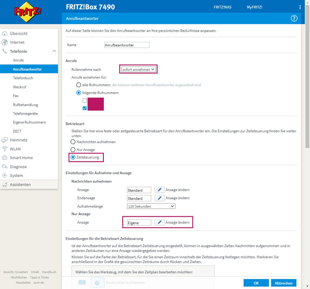 Hinweis: auf meinen Bildern ist die AB-Zeitsteuerung so eingerichtet, dass eine reine Ansage erfolgt. Du kannst natürlich auch einstellen, dass Nachrichten aufgenommen werden, indem du den Zeitraum dunkelblau markierst. Dann können deine Kunden dir auch Nachrichten hinterlassen.