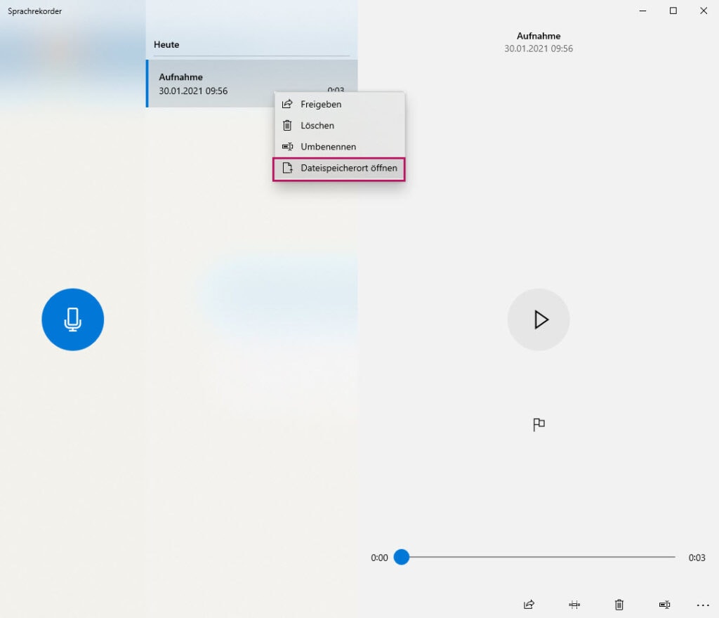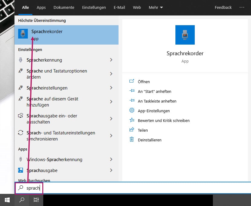 2. Öffnet eine App, mit der ihr Sound aufnehmen könnt. Unter Windows 10 z.B. den Sprachrekorder.
