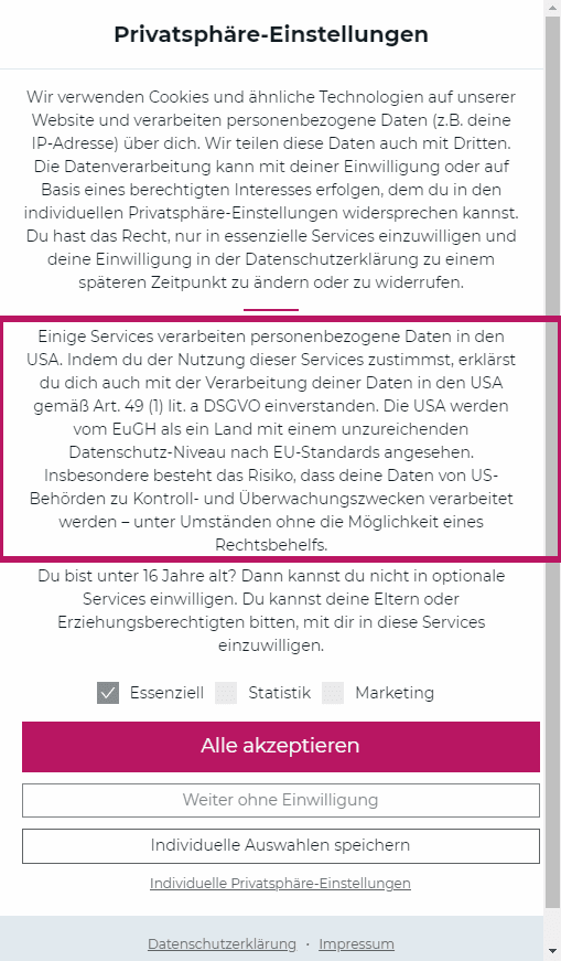 Der Cookie-Hinweis muss alle Dienste, die Cookies setzten, detailliert nennen und der Besucher muss ausdrücklich zustimmen oder ablehnen können. Die Buttons dafür müssen klar und verständlich sein und den Vorgang einfach ermöglichen.